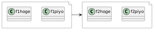 @startuml skinparam FileBackgroundcolor white file f1 [ {{ class f1hoge class f1piyo }} ] file f2 [ {{ class f2hoge class f2piyo }} ] f1 -ri-> f2 @enduml