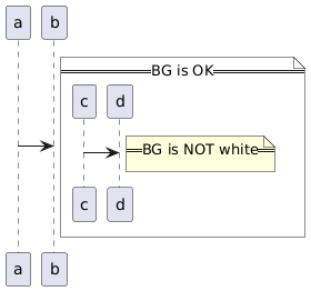 @startuml skinparam noteBackgroundColor White a->b note right == BG is OK == {{ c->d note right == BG is NOT white == end note }} end note @enduml