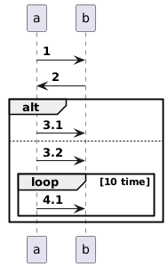 @startuml autonumber a->b a<-b autonumber 3.1 alt a->b else a->b autonumber inc A loop 10 time a->b end end @enduml