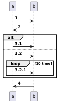 @startuml autonumber a->b a<-b autonumber 3.1 alt a->b else a->b autonumber 3.2.1 loop 10 time a->b end end autonumber 4 a<-b @enduml