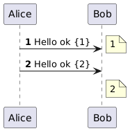 @startuml autonumber Alice -> Bob : Hello ok {%autonumber%} note right : %autonumber% Alice -> Bob : Hello ok {%autonumber%} note right of Bob : %autonumber% @enduml