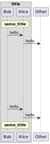 @startuml box "title" rnote over Bob, Alice : **same_title** participant Bob participant Alice end box participant Other Bob -> Alice : hello Alice -> Other : hello ... ... ... ... ... ... ... Bob -> Alice : hello Alice -> Other : hello rnote over Bob, Alice : **same_title** @enduml