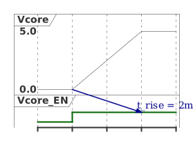 @startuml analog "Vcore" as VDD binary "Vcore_EN" as VDD_EN @VDD 0 is 0 1 is 0 3 is 5 @VDD_EN 1 is high VDD@1 -> VDD_EN@3: t_rise = 2ms @enduml
