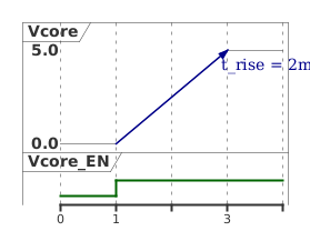 @startuml analog "Vcore" as VDD binary "Vcore_EN" as VDD_EN @VDD 0 is 0 1 is 0 3 is 5 @VDD_EN 1 is high VDD@1 -> VDD@3: t_rise = 2ms @enduml
