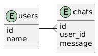 @startuml entity users { id name } entity chats { id user_id message } users -{ chats @enduml
