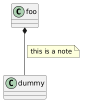 @startuml class foo foo *-- dummy note on link this is a note end note @enduml