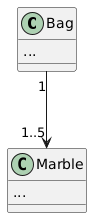 @startuml class Bag { ... } class Marble { ... } Bag --> Marble : "1" "1..5" @enduml