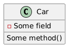 @startuml class Car { - Some field [[[http://plantuml.com]]] Some method() [[[http://plantuml.com/link]]] } @enduml