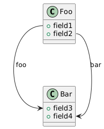 @startuml class Foo { + field1 + field2 } class Bar { + field3 + field4 } Foo::field1 --> Bar::field3 : foo Foo::field2 --> Bar::field4 : bar @enduml