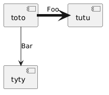 @startuml component toto component tutu component tyty !$mysthickness="thickness=5" toto -[$mysthickness]> tutu : Foo toto --> tyty : Bar @enduml