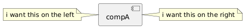@startuml component "compA" as compA { } note as N1 i want this on the right end note note as N2 i want this on the left end note compA -[hidden]right- N1 compA -[hidden]left- N2 @enduml