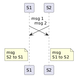 @startuml !pragma teoz true S1 ->(30) S2: msg 1\n & S2 ->(30) S1: msg 2 note left S1: msg\nS2 to S1 & note right S2: msg\nS1 to S2 @enduml