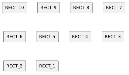 @startuml !procedure $more_rectangles($level) !if $level > 0 rectangle RECT_##$level $more_rectangles($level - 1) !endif !endprocedure $more_rectangles(10) @enduml