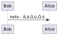 @startuml Bob -> Alice : hello : Ä,ä,Ü,ü,Ö,ö @enduml