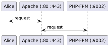 @startuml Alice <-> "Apache (:80 :443)" : request "Apache (:80 :443)" <-> "PHP-FPM (:9002)" : request @enduml