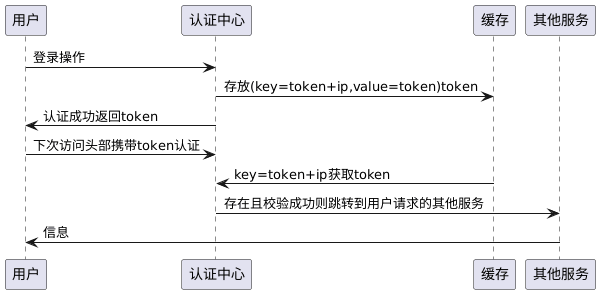 @startuml 用户 -> 认证中心: 登录操作 认证中心 -> 缓存: 存放(key=token+ip,value=token)token 用户 <- 认证中心 : 认证成功返回token 用户 -> 认证中心: 下次访问头部携带token认证 认证中心 <- 缓存: key=token+ip获取token 其他服务 <- 认证中心: 存在且校验成功则跳转到用户请求的其他服务 其他服务 -> 用户: 信息 @enduml