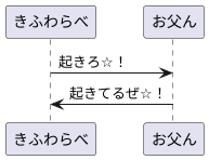 @startuml きふわらべ -> お父ん : 起きろ☆! きふわらべ <- お父ん : 起きてるぜ☆! @enduml