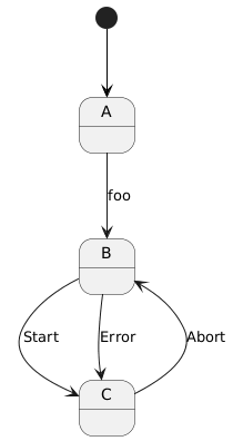 @startuml [*] -[#black]-> A A --> B : foo B --> C : Start C --> B : Abort B --> C : Error\t\t @enduml