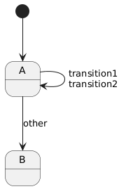 @startuml [*] --> A A --> A :transition1\ntransition2 A --> B : other @enduml