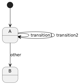 @startuml [*] --> A A --> A :transition1 A --> A :transition2 A --> B : other @enduml
