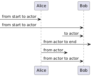 @startuml [-> Alice : from start to actor [-> Bob : from start to actor ?-> Bob : to actor Alice ->] : from actor to end Alice ->? : from actor Alice -> Bob : from actor to actor @enduml