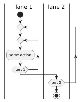 @startuml |lane 1| start repeat repeat :some action; repeat while(test 1); |lane 2| repeat while(test 2); stop @enduml