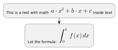 @startuml :This is a test with math <math>a*x^2+b*x+c</math>inside text; :Let the formula: <math>int_0^1f(x)dx</math>; @enduml