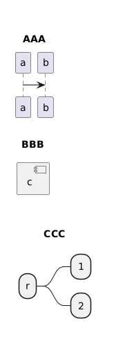 @startuml label l [ {{ title AAA a -> b }} {{ title BBB [c] }} {{mindmap title CCC * r ** 1 ** 2 }} ] @enduml