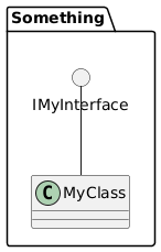 @startuml namespace Something { class MyClass circle IMyInterface IMyInterface -- MyClass } @enduml