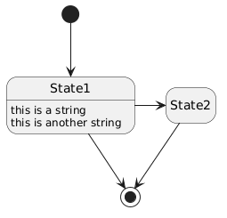 @startuml hide empty description [*] --> State1 State1 --> [*] State1 : this is a string State1 : this is another string State1 -> State2 State2 --> [*] @enduml