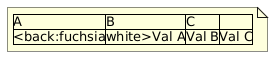 @startuml note as MYNOTE |A|B|C| |<back:fuchsia|white>Val A|Val B|Val C| end note @enduml