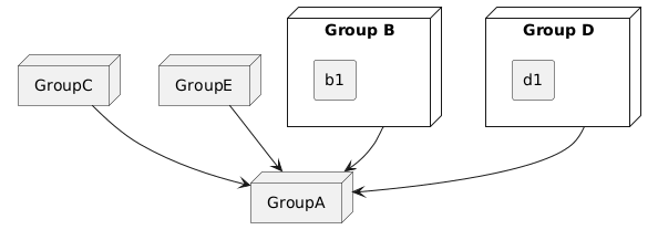 @startuml node GroupA node "Group B" as GroupB{ rectangle b1 } node GroupC { } node GroupD as "Group D" { rectangle d1 } node GroupE GroupB --> GroupA GroupC --> GroupA GroupD --> GroupA [GroupE] --> GroupA @enduml