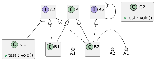 @startuml interface A1 interface A2 class B1 extends P implements A1 { } class B2 extends P implements A1,A2 { } class C1 { +test : void() } class C2 { +test : void() } class P { } B1 -() A1 B2 -() A1 B2 -() A2 A1 )-- C1 A2 )-- A2 @enduml
