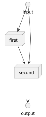 @startuml interface input interface output node first node second first --> second input --> first input --> second second --> output @enduml