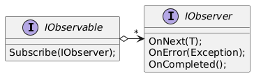 @startuml interface IObservable{ Subscribe(IObserver); } interface IObserver{ OnNext(T); OnError(Exception); OnCompleted(); } IObservable o-> "*" IObserver @enduml