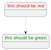 @startuml state "<color:red>this should be red</color>" as s1 state "<color:green>this should be green</color>" as s2 s1 -[dotted]-> s2 @enduml