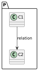 @startuml package P { class C1 { } class C2 { } C1 --> C2:relation } @enduml