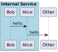 @startuml box Internal Service #LightBlue participant Bob participant Alice end box participant Other Bob -> Alice : hello Alice -> Other : hello @enduml
