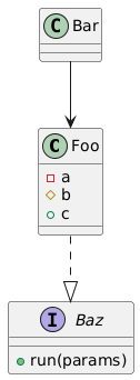 @startuml class Foo{ - a # b + c } class Bar{} interface Baz{ + run(params) } Bar --> Foo Foo ..|> Baz @enduml