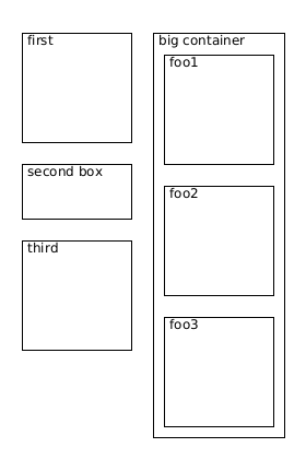 @startwire * first * second_box [100x50] * third -- * big_container * foo1 * foo2 * foo3 @endwire
