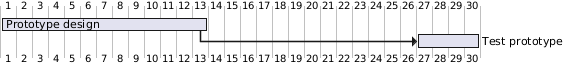 @startgantt !$foo = 13 [Prototype design] lasts 13 days [Test prototype] lasts 4 days [Test prototype] starts $foo days after [Prototype design]'s end @endgantt