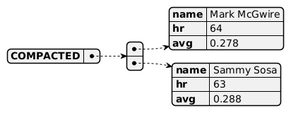 @startyaml COMPACTED: - name: Mark McGwire hr: 64 avg: 0.278 - name: Sammy Sosa hr: 63 avg: 0.288 @endyaml
