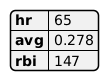@startyaml hr: 65 # Home runs avg: 0.278 # Batting average rbi: 147 # Runs Batted In @endyaml