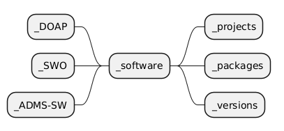 @startmindmap + _software ++ _projects ++ _packages ++ _versions -- _DOAP -- _SWO -- _ADMS-SW @endmindmap