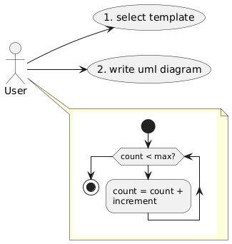 @startuml 'If you uncomment this line, then the UnsupportedOperationException on EmbeddedDiagram$Draw.splitInTwo() does not happen skinparam wrap_width 150 left to right direction actor User User --> (1. select template) User --> (2. write uml diagram) note right of User {{ skinparam wrap_width 150 start while (count < max?) :count = count + increment; endwhile stop }} end note @enduml
