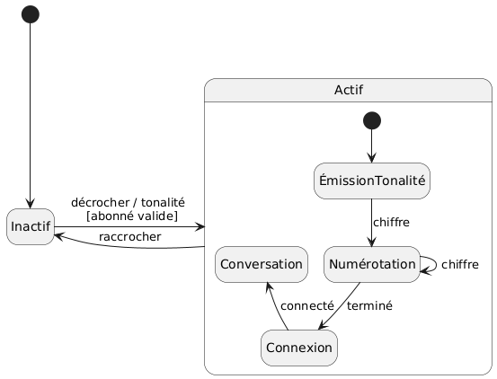 @startuml skinparam style strictuml skinparam backgroundcolor transparent skinparam DefaultTextAlignment center hide empty description [*] --> Inactif Inactif -> Actif : décrocher / tonalité \n [abonné valide] Actif -> Inactif : raccrocher state Actif { [*] --> ÉmissionTonalité ÉmissionTonalité --> Numérotation : chiffre Numérotation --> Connexion: terminé Numérotation --> Numérotation : chiffre Connexion -u-> Conversation : connecté } @enduml