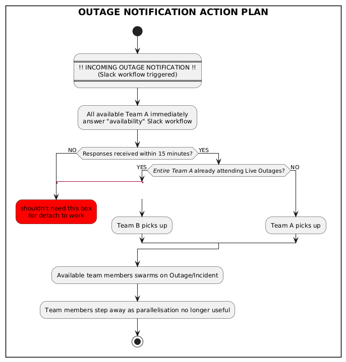 @startuml skinparam defaultTextAlignment center skinparam ConditionEndStyle hline '!pragma useVerticalIf on rectangle "= OUTAGE NOTIFICATION ACTION PLAN" start :==== !! INCOMING OUTAGE NOTIFICATION !! (Slack workflow triggered) ====; :All available Team A immediately\nanswer "availability" Slack workflow; if (Responses received within 15 minutes?) then (NO) label spacer label lab #red:shouldn't need this box\nfor detach to work; detach else (YES) if (//Entire Team A// already attending Live Outages?) then (YES) ' the following "goto" should be a "comefrom" and not terminate the flow goto lab label spacer2 :Team B picks up; else (NO) label spacer3 label spacer4 :Team A picks up; endif endif :Available team members swarms on Outage/Incident; :Team members step away as parallelisation no longer useful; stop @enduml