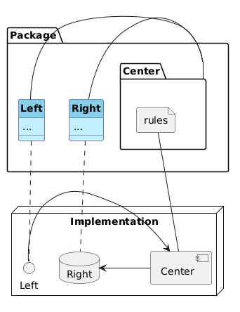 @startuml hide circle hide stereotype allow_mixing skinparam class<<MD>> { BorderColor DarkSlateGray BackgroundColor WhiteSmoke HeaderBackgroundColor #909090 } skinparam class<<TM>> { BorderColor #505090 BackgroundColor APPLICATION HeaderBackgroundColor SkyBlue } Package "Package" as S { class "**Left**" as RR<<TM>> { ... } Package "**Center**" as AR { file "rules" as P } class "**Right**" as DC<<TM>> { ... } RR -r- AR : " " AR -r- DC : " " } node "Implementation" as I { circle "Left" as Req component "Center" as AC database "Right" as DB Req -r-> AC : " " AC -r-> DB : " " } 'RR -d[hidden]- I DC .d. DB RR .d. Req P -d- AC @enduml
