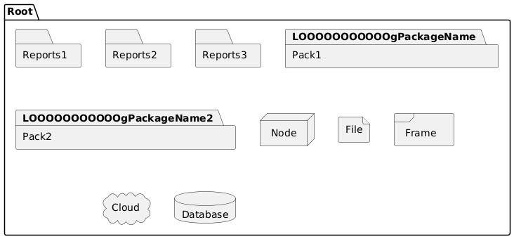@startuml Folder Root as "Root" { Folder "Reports1" as LOOOOOOOOOOOgName Folder "Reports2" as aaa Folder VeryLOOOOOOOOOOOOOOOOOOOgName as "Reports3" package "Pack1" as LOOOOOOOOOOOgPackageName package LOOOOOOOOOOOgPackageName2 as "Pack2" Node "Node" as LOOOOOOOOOOOgNodeName File "File" as LOOOOOOOOOOOgFileName frame "Frame" as LOOOOOOOOOOOgFrameName cloud "Cloud" as LOOOOOOOOOOOgCloudName database "Database" as LOOOOOOOOOOOgDatabaseName } @enduml