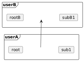 @startuml 'skinparam defaultTextAlignment center skinparam interface { BackgroundColor transparent BorderColor transparent shadowing false } frame userA { card root interface " " as h1 card sub1 } frame userB { card rootB interface " " as h2 card subB1 } h1 -up-> h2 root -[hidden]up-> rootB @enduml